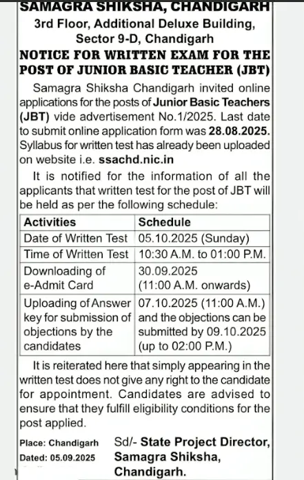- Candidates are advised to confirm from the Samagra Shiksha Chandigarh (SSA), Chandigarh official website.