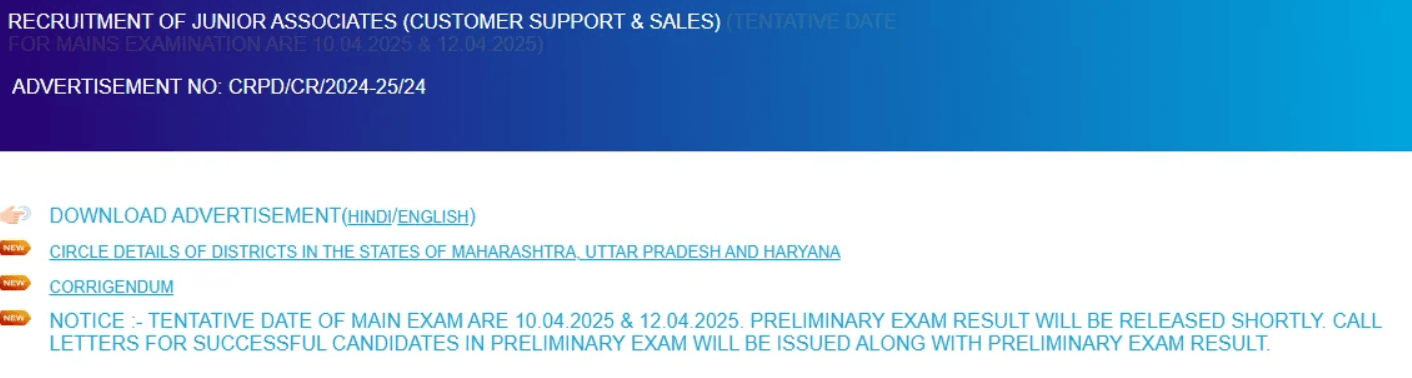 The SBI Clerk Recruitment 2024 was conducted to fill vacancies across various branches of the State Bank of India for the post of Junior Associate (Customer Support & Sales). The online application process closed on 7th January 2025, and the mains examination was held from 10th to 12th April 2025. Candidates were shortlisted based on their performance in the preliminary and mains exams, followed by the release of the final result and wait lists. This recruitment drive was announced under Advt No. CRPD/R/2024-25/24 and CRPD/CR-SPLDRIVE/2024-25/23, and selection is subject to document verification and final joining formalities.